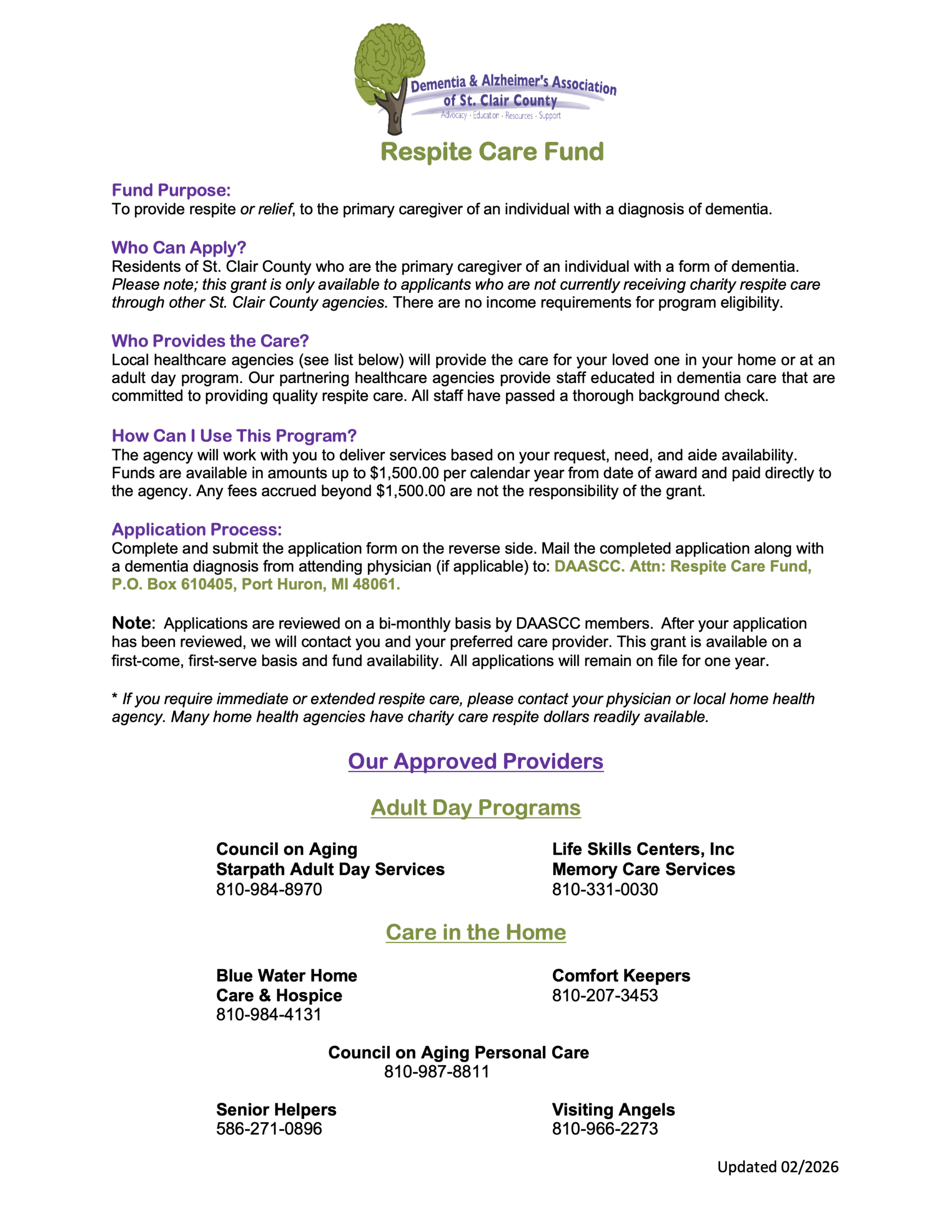 The DAASCC Respite Care Fund provides grants for respite care for caregivers in St. Clair County.
